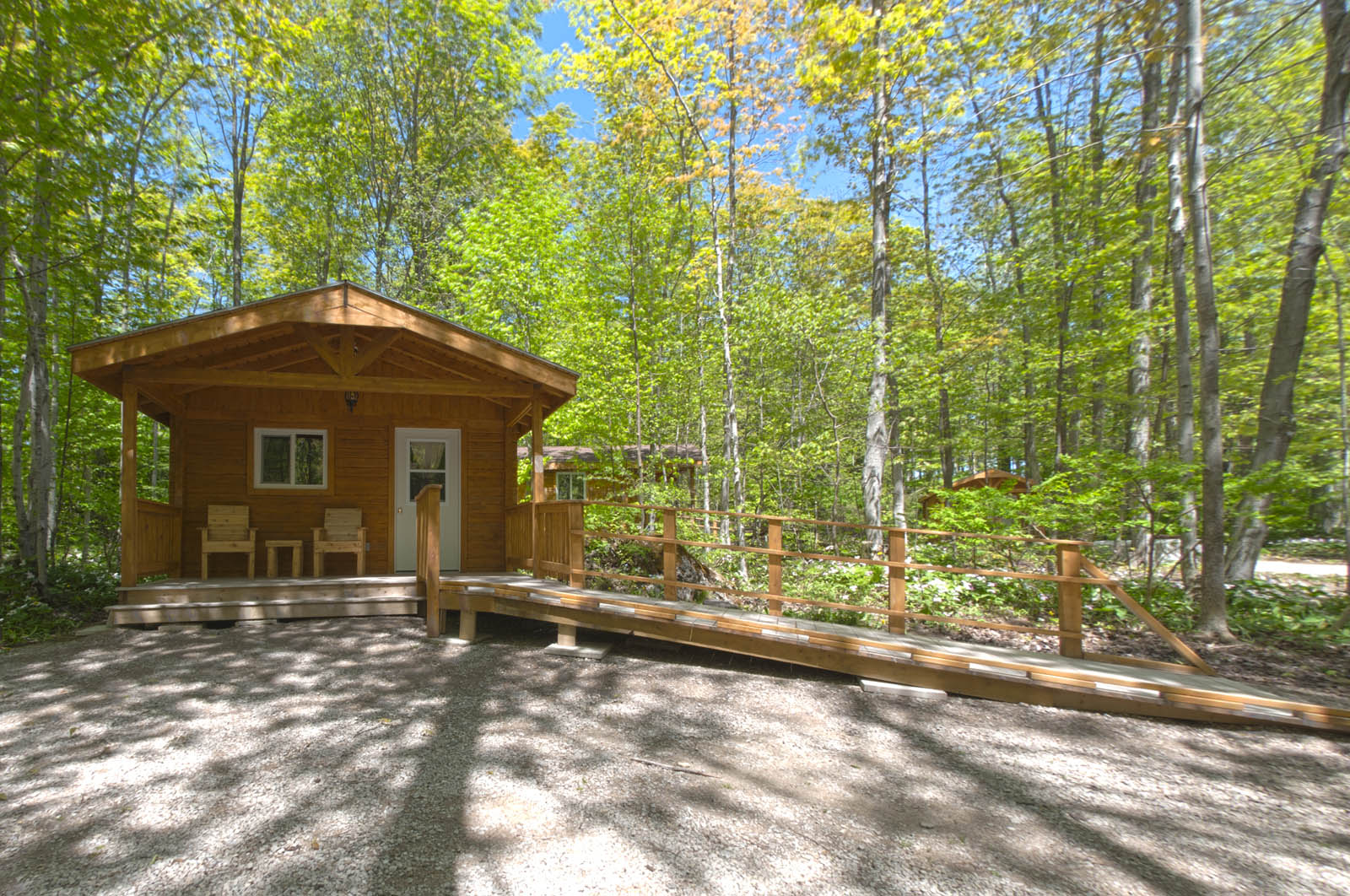 This log camping cabin, located in our hardwood forest, is wheel-chair accessible and sleeps up to 6 people. Like our other camping cabins units, this basic cabin offers a small fridge, outdoor cooking grill, fire pit and picnic table. Centralized washrooms next door and laundromat close by.