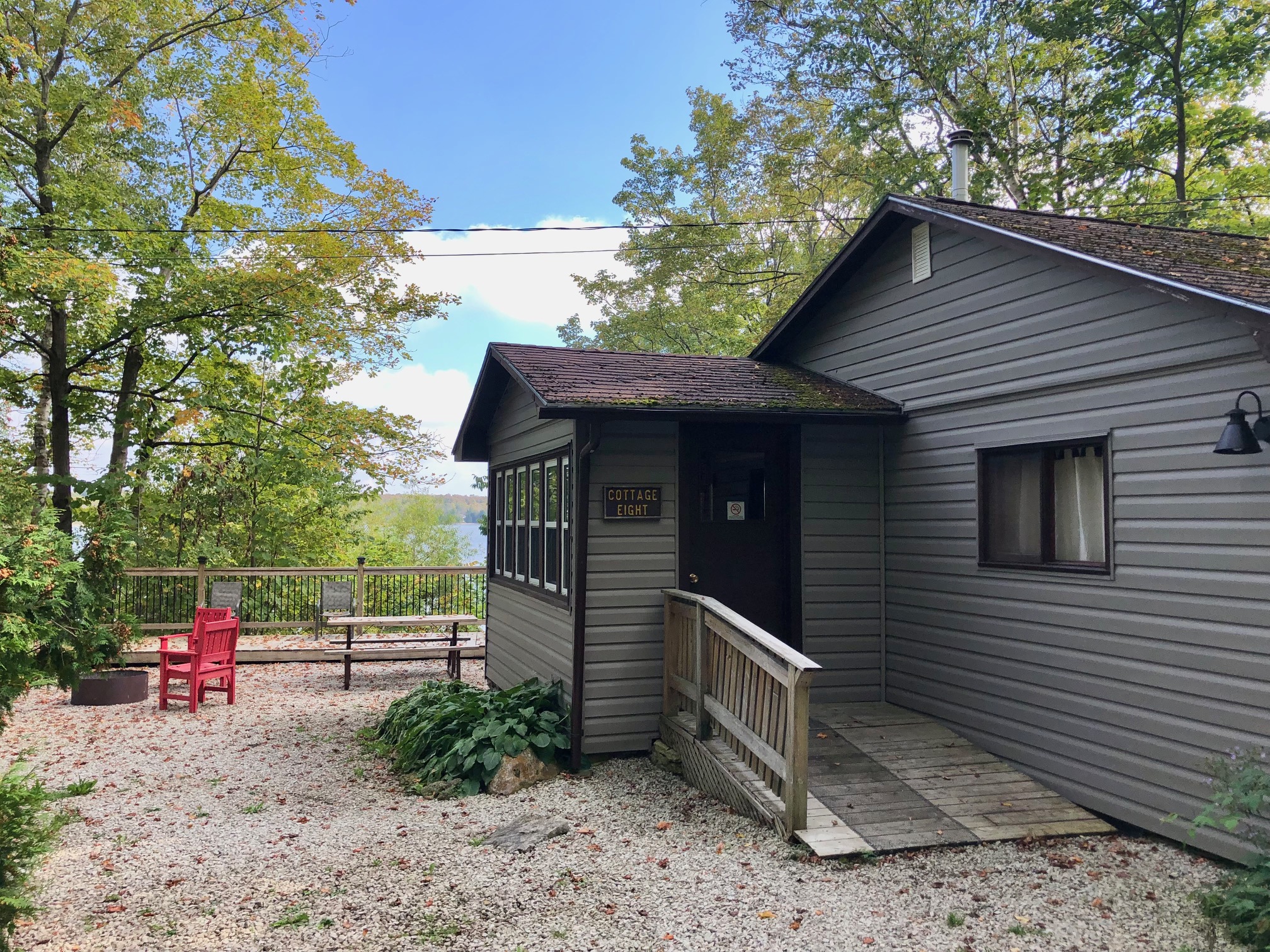 This two bedroom cottage is located on an escarpment above the waters of Miller Lake. Relax on your own private deck overlooking Miller Lake! Adjacent to central washrooms and close to the pet beach and other park recreation. Pet friendly.