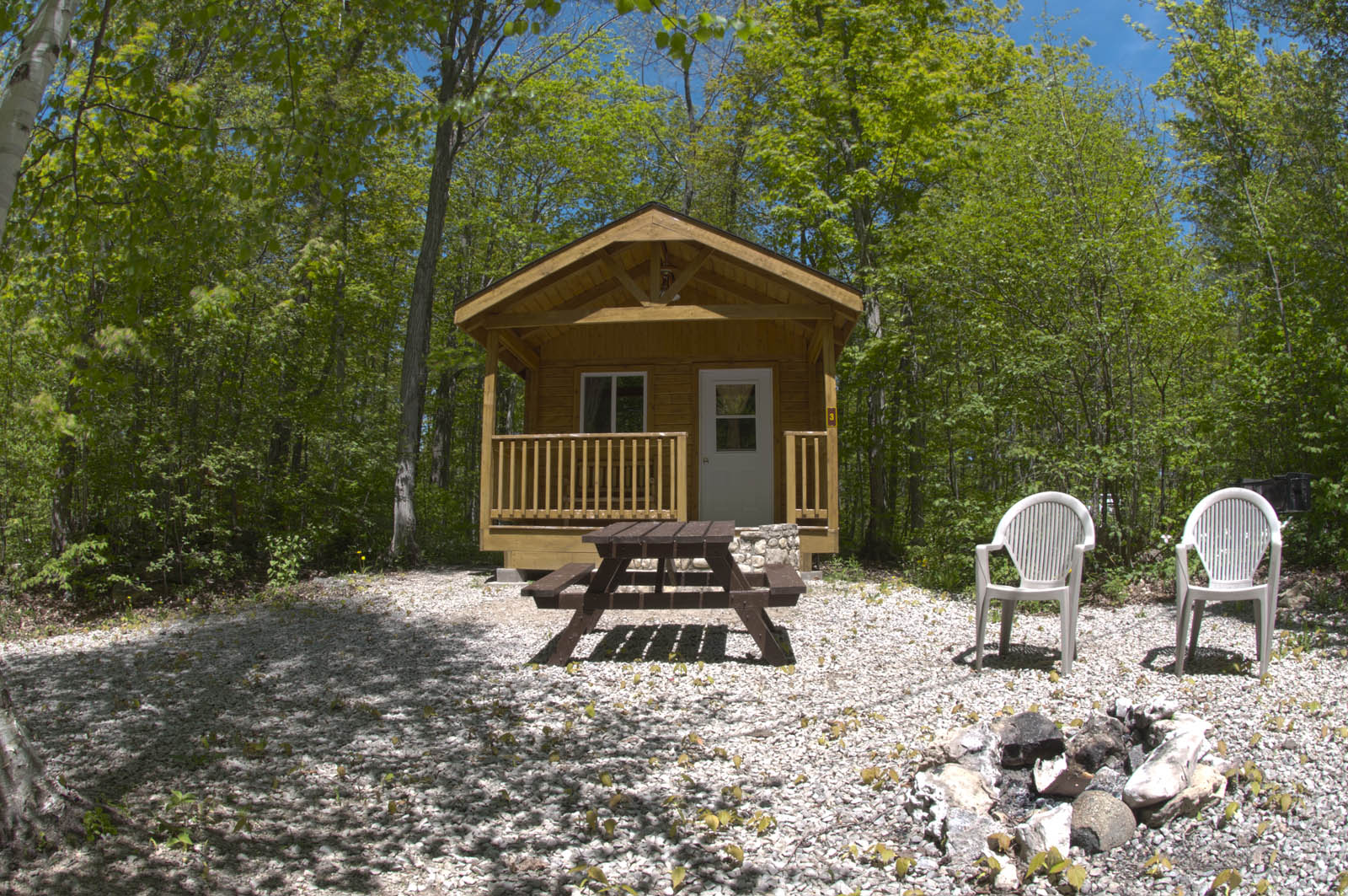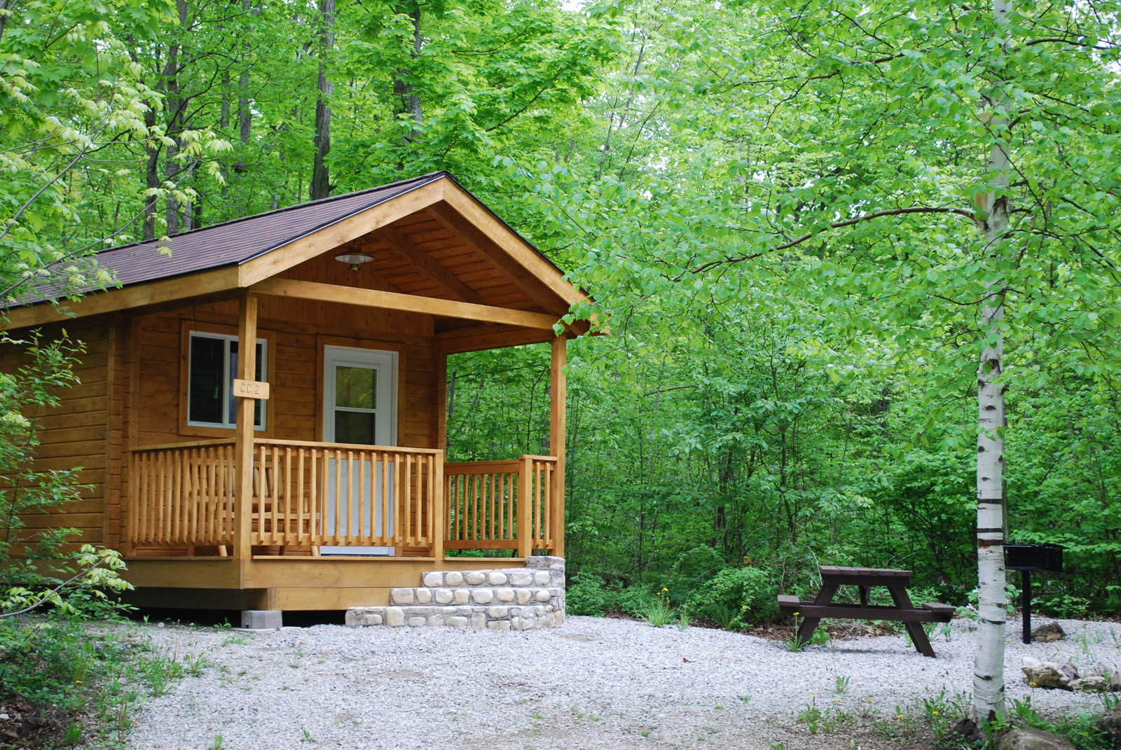 This log camping cabin is located in the campground's hardwood maple forest. Perfect for those who wish to camp and still have some 'creature-comforts!" This basic cabin offers a small fridge, outdoor cooking grill, fire pit and picnic table. Centralized washrooms next door and laundromat close by.